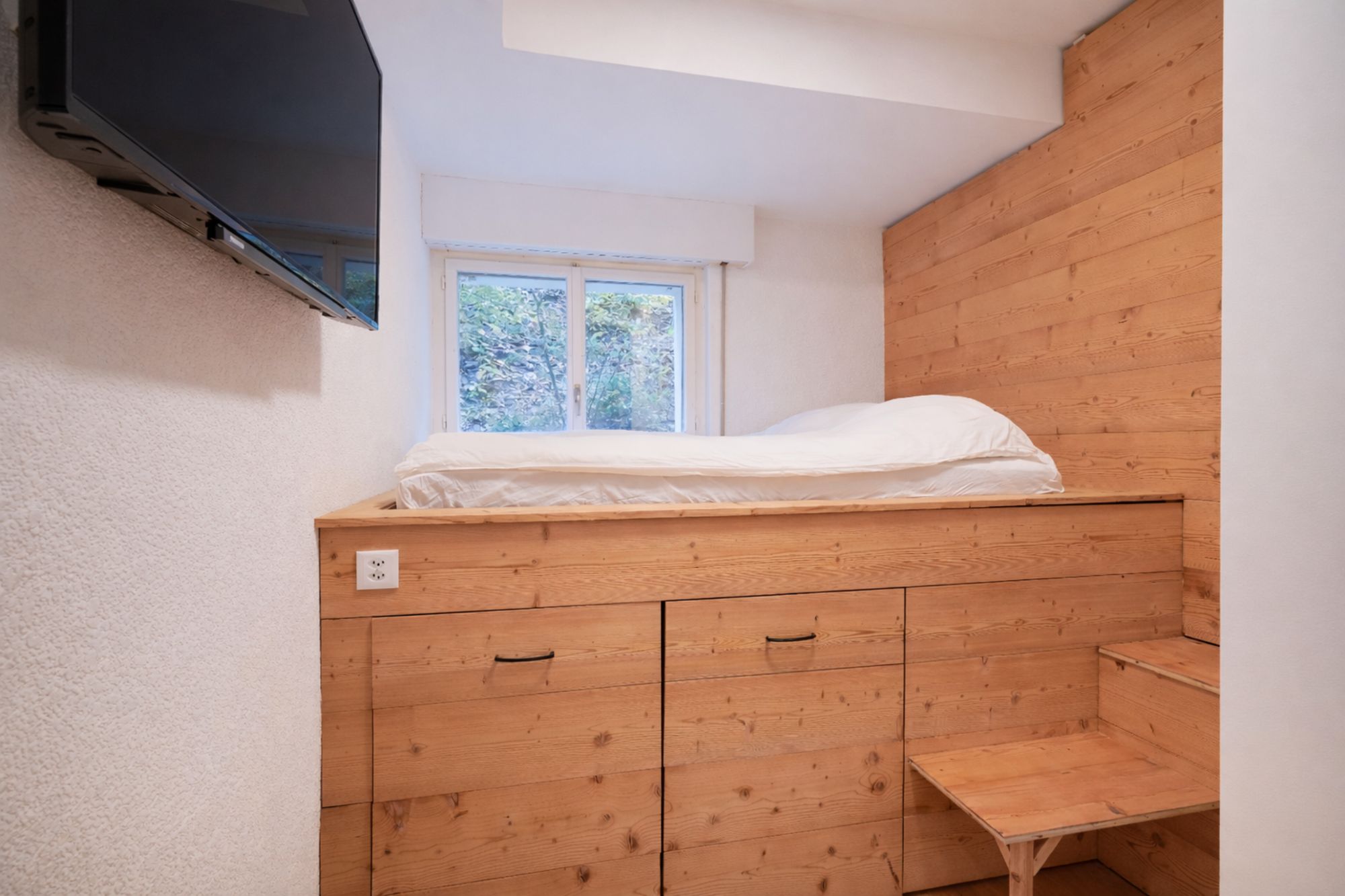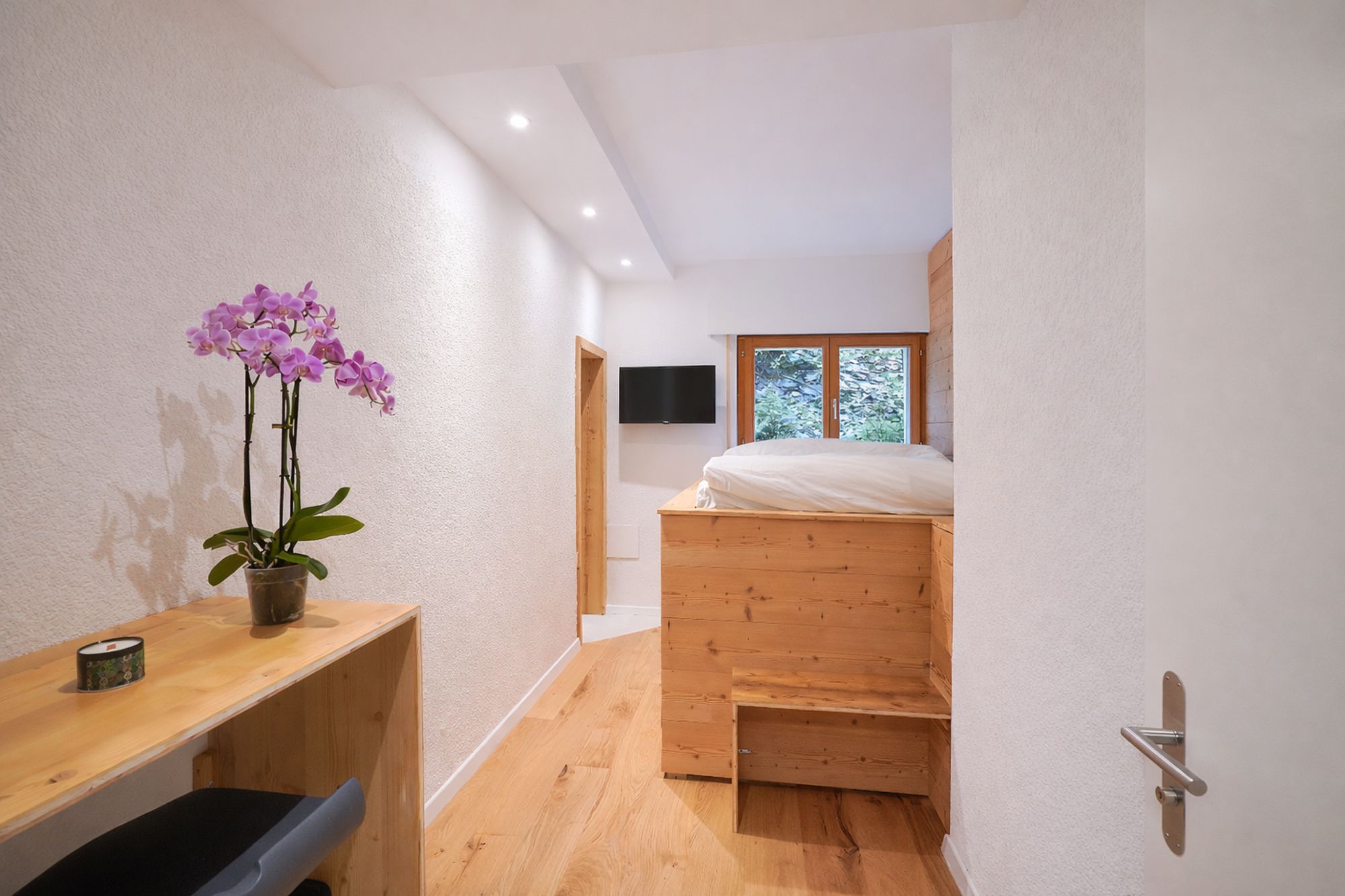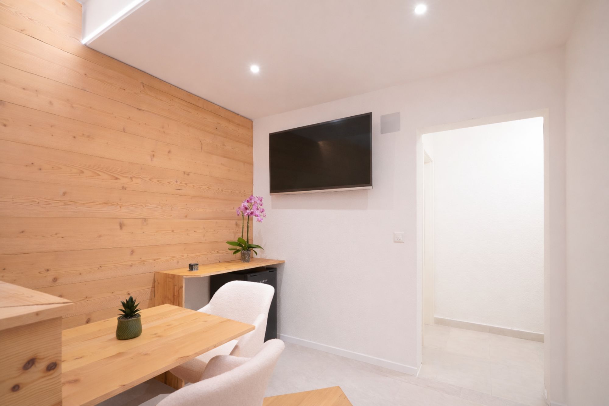 Le projet a porté sur la réfection complète des chambres : reprise des finitions, mise en peinture, intégration de parements bois et création d’ambiances lumineuses avec un travail soigné sur l’éclairage. Les sols ont été entièrement remplacés et des aménagements sur mesure ont été réalisés, notamment des mobiliers intégrés et habillages bois, pour renforcer le caractère “chalet” tout en apportant une ligne contemporaine.