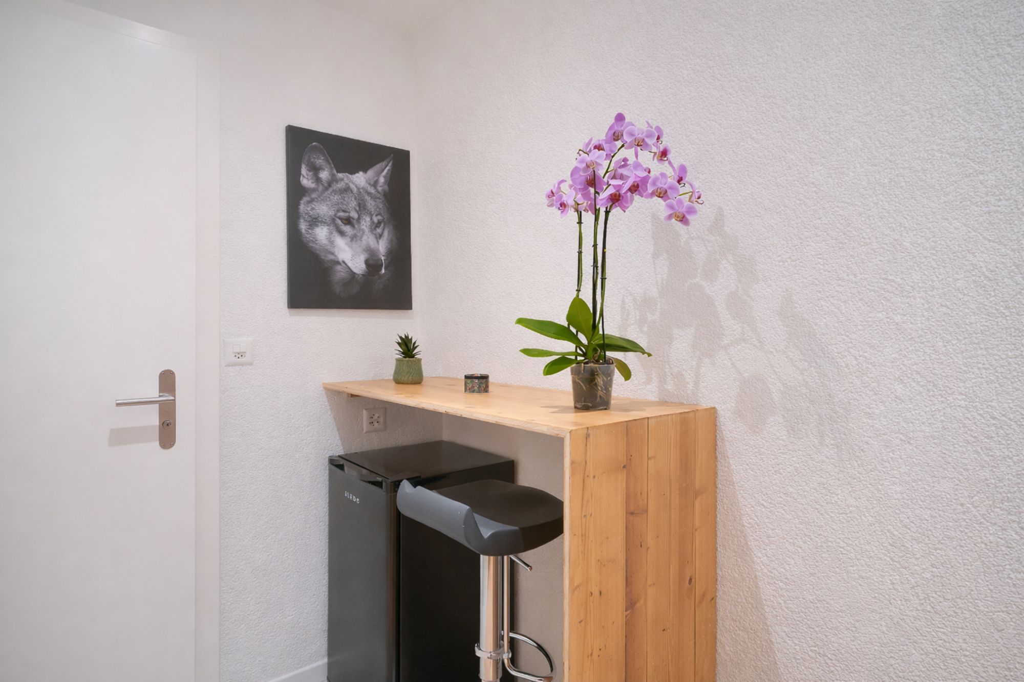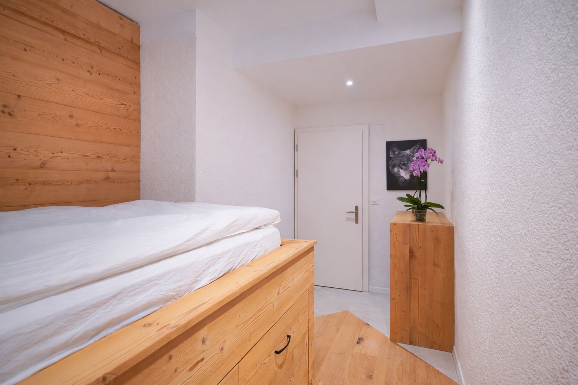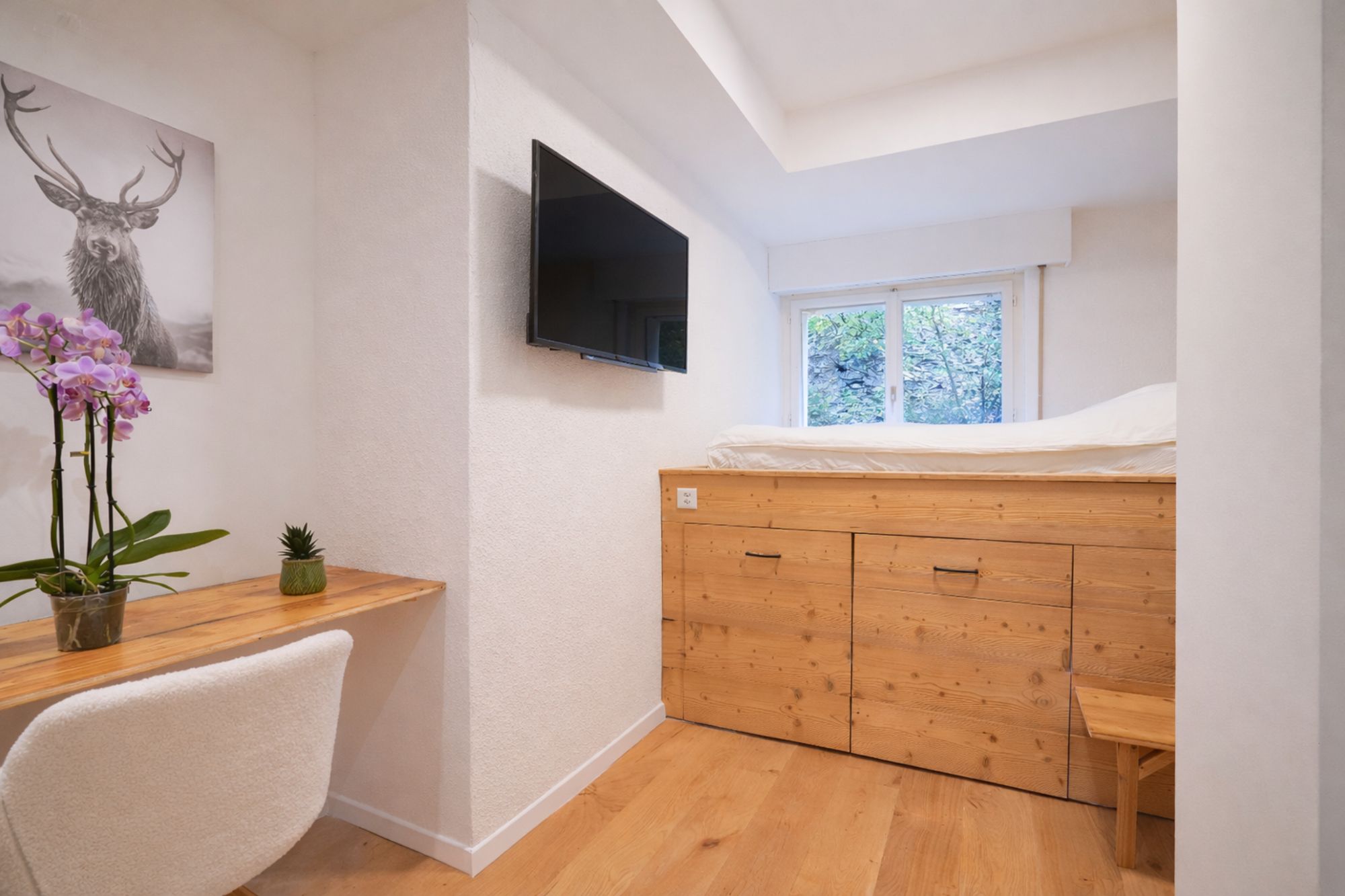 Le projet a porté sur la réfection complète des chambres : reprise des finitions, mise en peinture, intégration de parements bois et création d’ambiances lumineuses avec un travail soigné sur l’éclairage. Les sols ont été entièrement remplacés et des aménagements sur mesure ont été réalisés, notamment des mobiliers intégrés et habillages bois, pour renforcer le caractère “chalet” tout en apportant une ligne contemporaine.